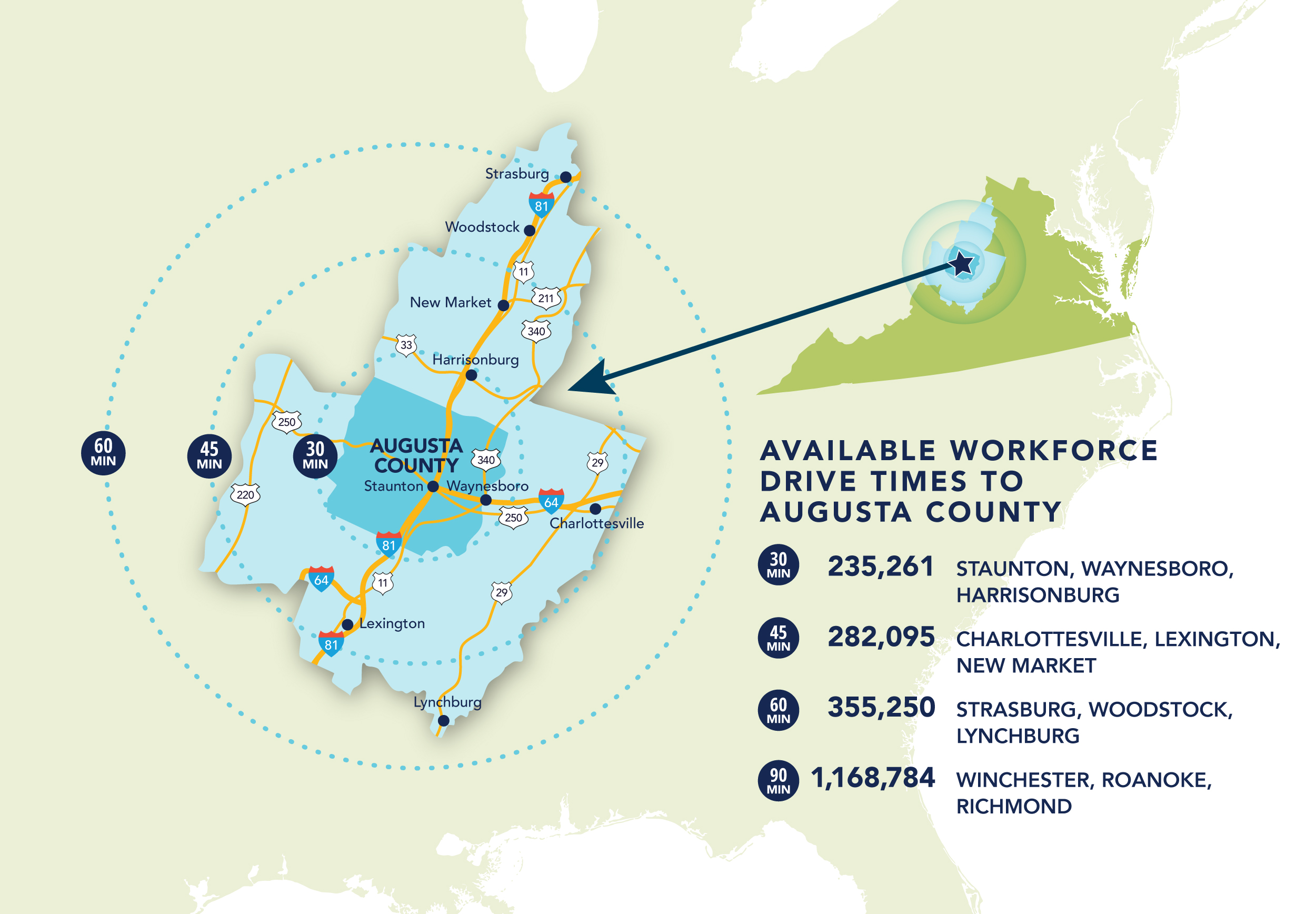 In Augusta County and the surrounding region, we provide a quality, motivated, and skilled labor base. Employers can recruit from a pool of over 22,000 annual graduates from 14 colleges and universities in the area. Virginia is a right-to-work state with one of the lowest unionization rates in the country.